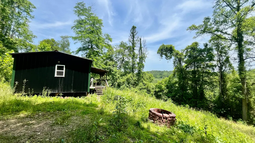 The cabin sits up the hill, high and dry, facing out over the Hocking River. Enjoy your evenings on the front porch or around the fire pit. And check out the cabin, its a 16x36 structure with a 7x22 covered porch, metal siding and roof, and electric (AEP meter already installed). Inside, its set up with: