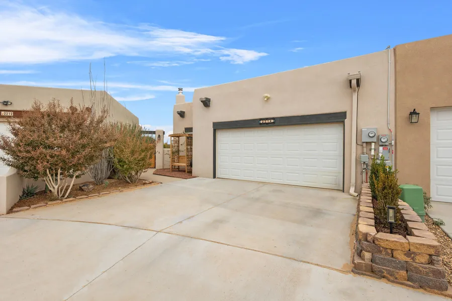 Benefit from reduced energy cost solar panels! Welcome to your dream home in an exclusive gated community! This stunning property boasts over 2,000 sq ft of well-designed living space, featuring 3 spacious bedrooms, 2 baths, and thoughtful finishes throughout. The primary bath offers a relaxing garden tub, double sinks, and an inviting layout. You'll love cozy evenings by either of the two authentic Kiva fireplaces, while the tiled entryway & natural stone countertops add a touch of elegance. Wooden beam ceiling and slate tile floors. The home also includes a heated and cooled double-car garage for year-round comfort. Step outside to enjoy beautifully landscaped front and backyards with an auto-drip system, a covered patio and pergola. Easy freeway access and close to local amenities.