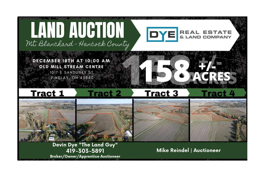 LAND AUCTION! 158 +/- ACRES IN MOSTLY DELAWARE TOWNSHIP, HANCOCK COUNTY, OHIO OFFERED IN 4 TRACTS (INDIVIDUALLY, COMBINATION OR AS A WHOLE)