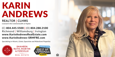Research Parcel InformationKarin Andrews is passionate about and inspired by old homes and gardens, by breathtaking water views, rolling pastoral landscapes, towering trees and ancient boxwood. She has successfully represented sellers and purchasers of iconic historic, waterfront and equestrian properties throughout the Northern Neck, Middle Peninsula, Central Virginia and Shenandoah Valley.