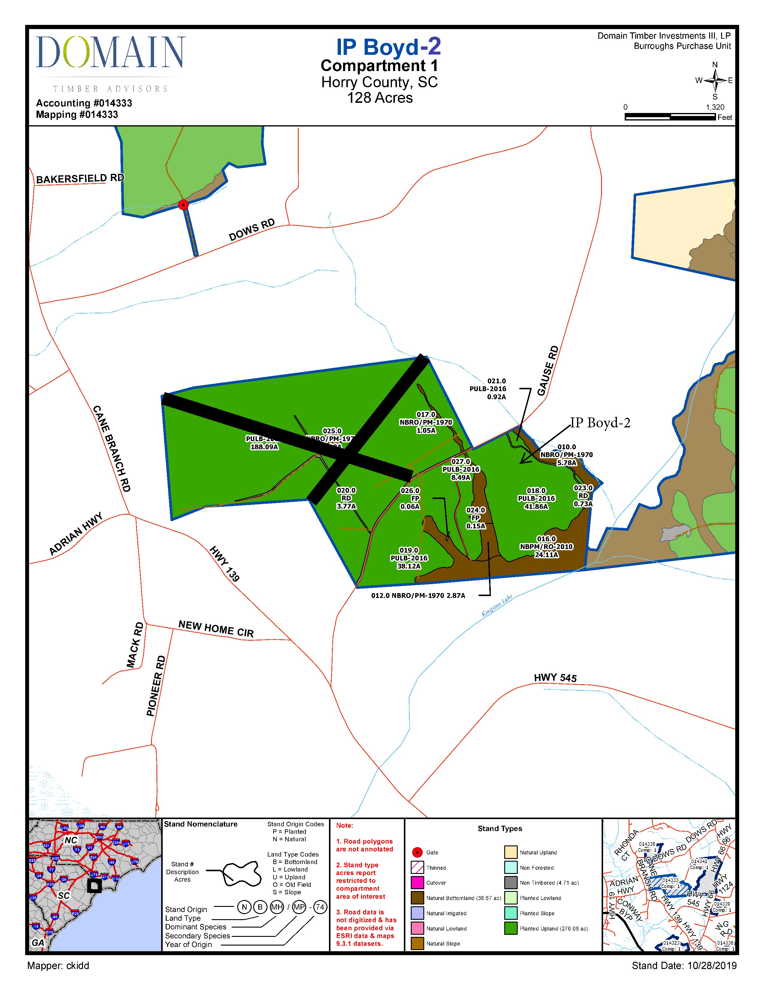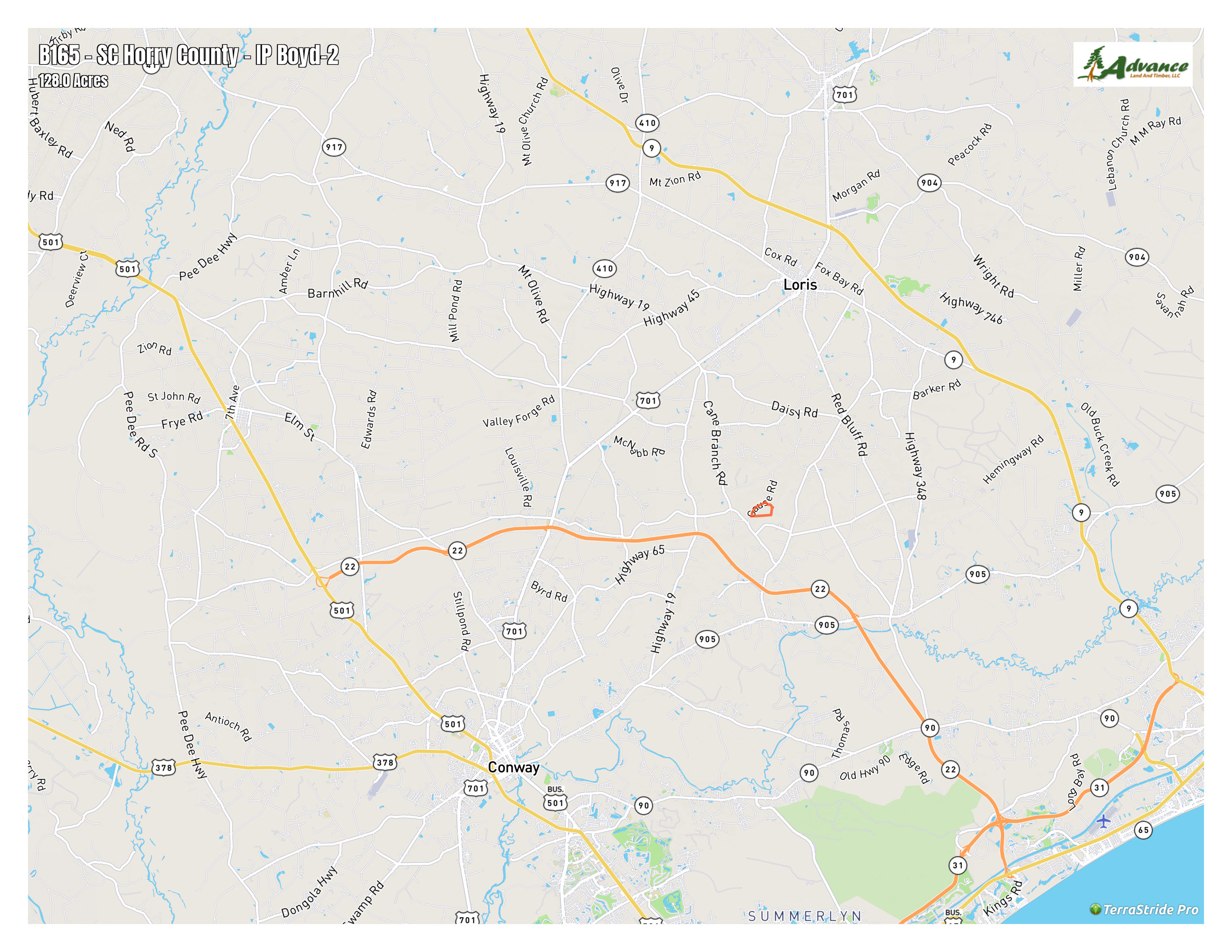 This property is right in the path of future development for Horry County. Located along Gause Road. Just north of 22 Bypass, you are just a short drive from downtown Conway. This tract offers 3,582 ft of road frontage along Gause Road, which would allow for it to be broken into many smaller tracts or a subdivision. Out of the total 128 acres there are 90 acres of 5-year-old planted loblolly pines with the remaining 36 acres of hardwoods located along the far side of the property. There are 2 gated entrances to access this property and is loaded with deer.