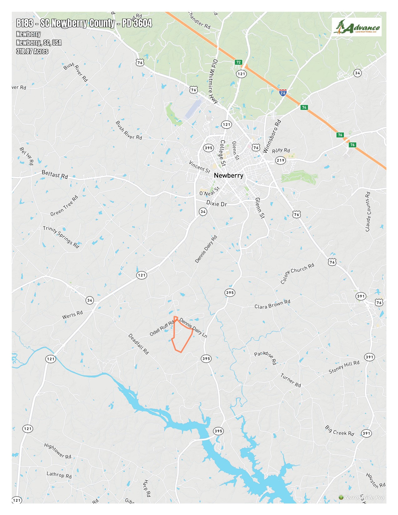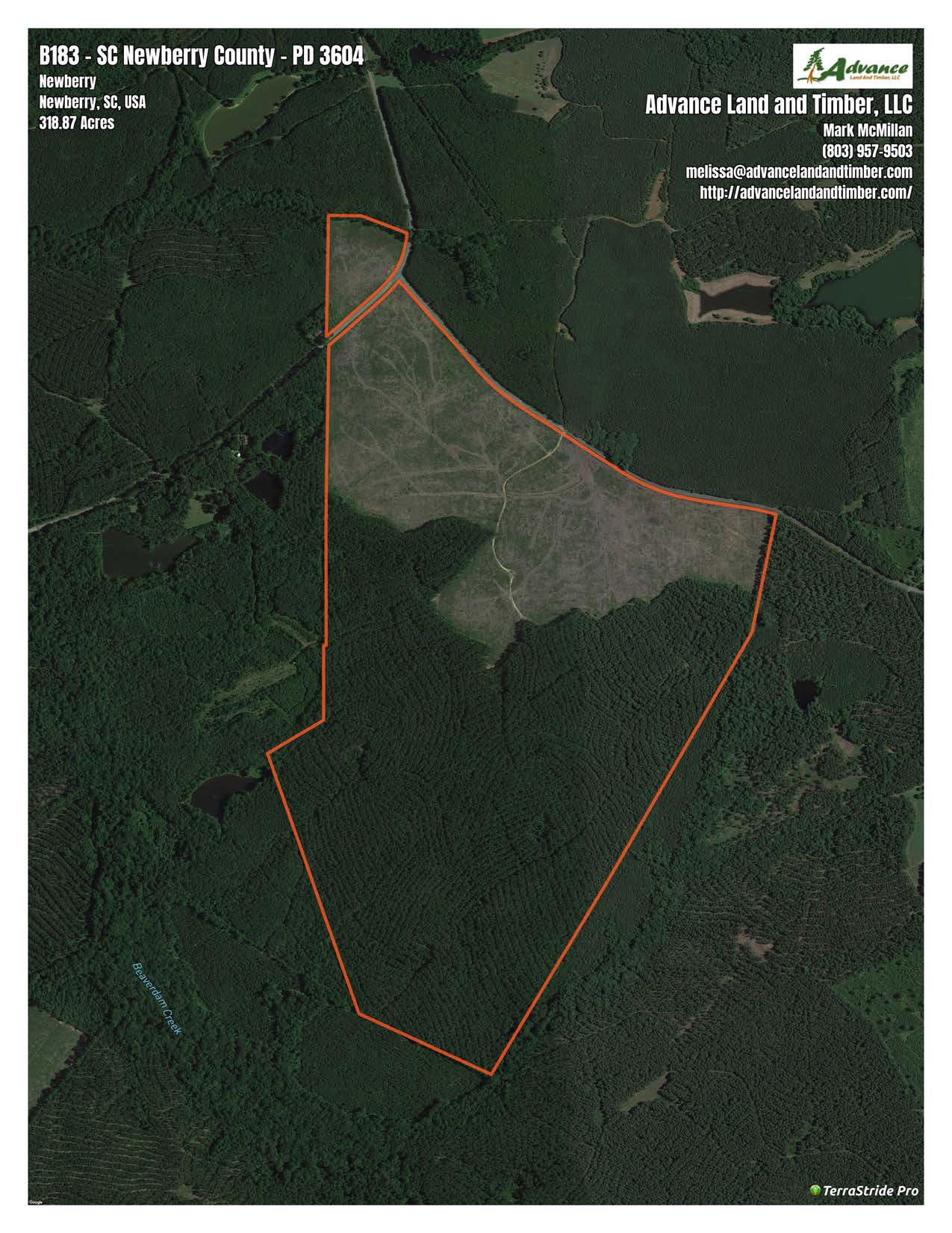 This property consists of 318 acres at the corner of Dennis Dairy Lane and Odell Ruff Road in Newberry County. There are 113 acres at the front of the property that were planted in loblolly pines 3 years ago, with the remaining acreage in the back being 95 acres of 32-year-old planted pines and 109 acres of recent clearcut. This property is surrounded by large landowners and is loaded with deer and turkeys. It has 0.66 miles of frontage on Dennis Dairy Lane and an 8-acre parcel on the north side of Odell Ruff Road which would give the future owner the possibility of subdividing lots.
