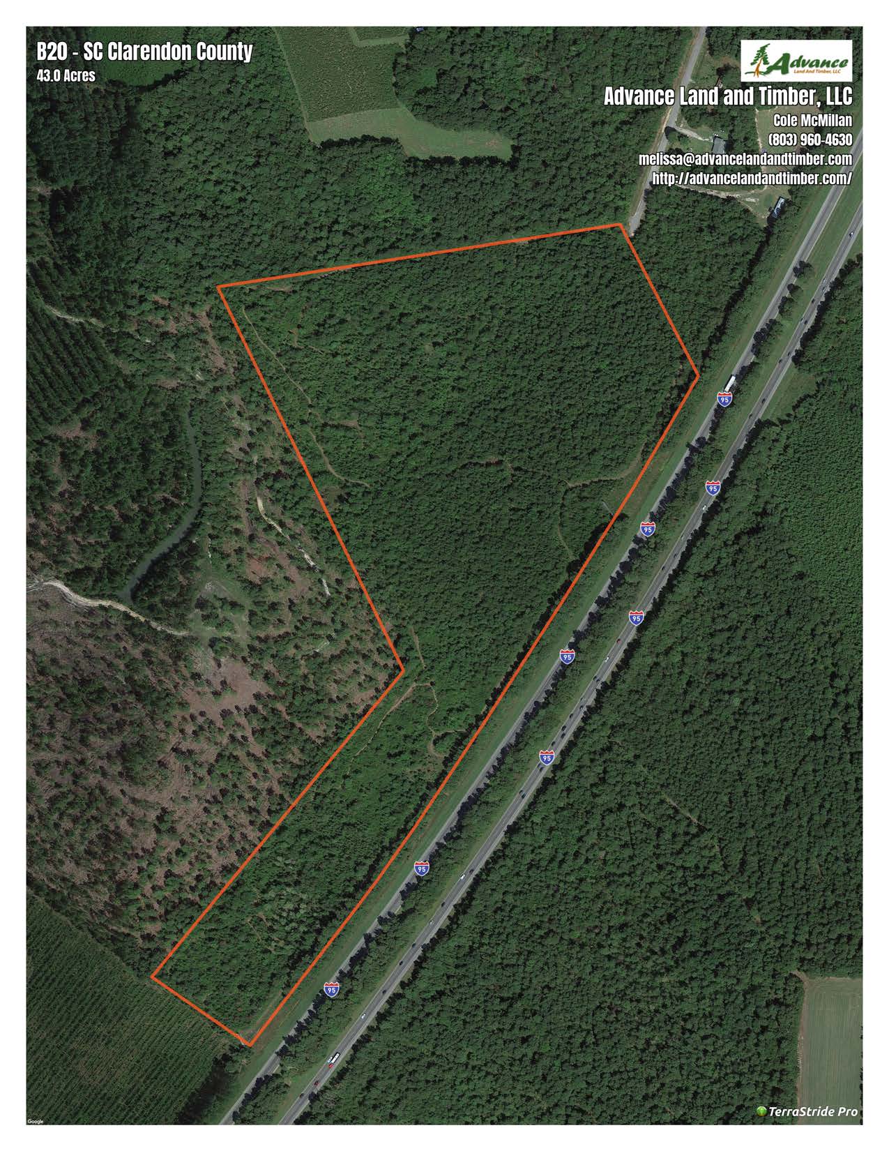 This recreational tract consists of 43+/- acres located at the end of Acorn Lane in Manning, SC. It has great seclusion and would make an awesome hunting property. There is 2,650 feet of I-95 frontage, but the two billboard signs on the property that will not transfer with the sale. The current owner is in the process of fixing an existing road along the boundary which will allow access to every corner. This property has been managed as a hunting tract for a number of years for deer and turkey. It was planted in loblolly pines in 2005 and could be thinned for immediate revenue or opened up for food plots.