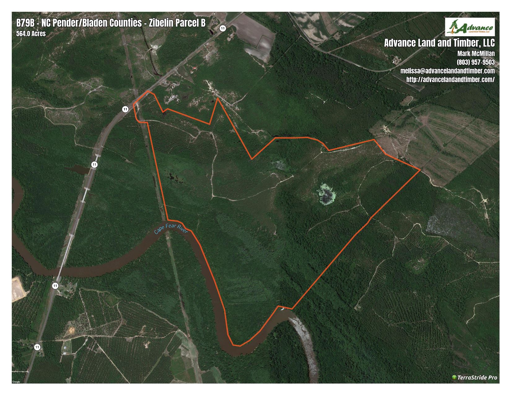 Parcel B has a total of 564 acres located off Hwy 11 in Bladen & Pender Counties, NC. This area is known for its tremendous duck hunting as well as bears, deer, turkey and hogs. There are two duck holes located on this property, one being close to 6 acres in size. This property boasts 1.25 miles of Cape Fear River frontage and has over 3.5 miles of internal roads allowing access to all corners of the property including a road that runs parallel with the river. This tract is very unique and has all of the qualities an outdoor enthusiast and timberland investor could want. There are 146 acres of planted loblolly pine plantations ranging from 60 years old to 15-year-old stands. It has 81 acres of 2004 longleaf pine plantation that is ready to be raked for pine straw and about 280 acres that consist of hardwood.