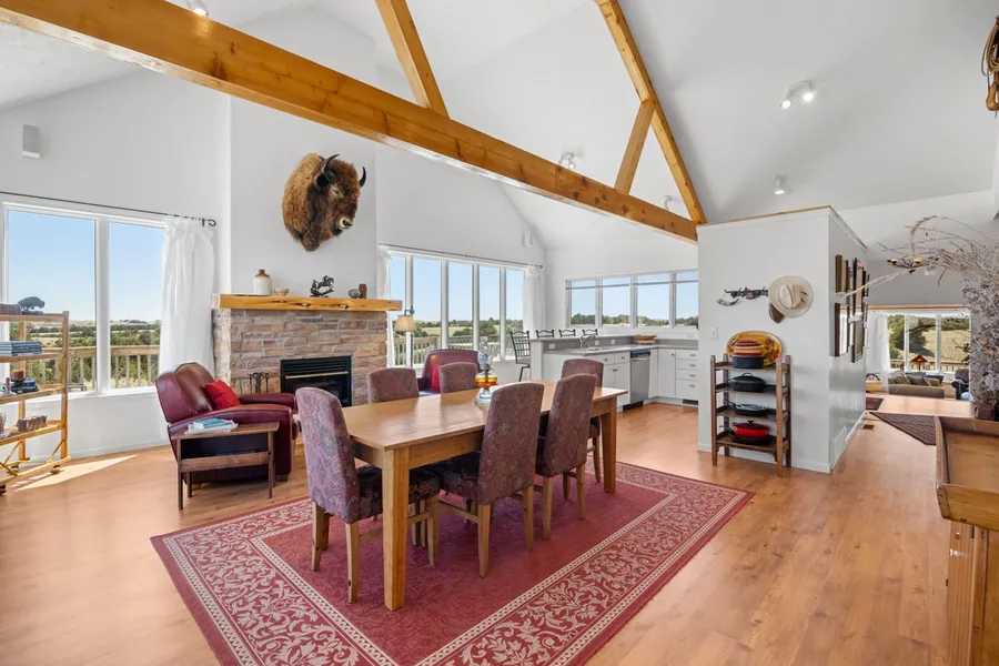 The main level plus loft area equates to 1,768 sq ft with an additional 672 sq ft in the basement. Upon entering the main level, you will first notice the panoramic windows, lofted ceiling with custom wood beams and the custom fireplace with bison mount, that will stay. Here is where the dining area, cozy living area and the eat-in kitchen can be found. Also located on this side of original home is one main level bedroom, one full bathroom, linen closet, pantry storage and stairs to loft area and basement. The addition (built in 2007) features a large living area with panoramic windows, double doors to the wraparound deck and matching wood beams and custom fireplace.