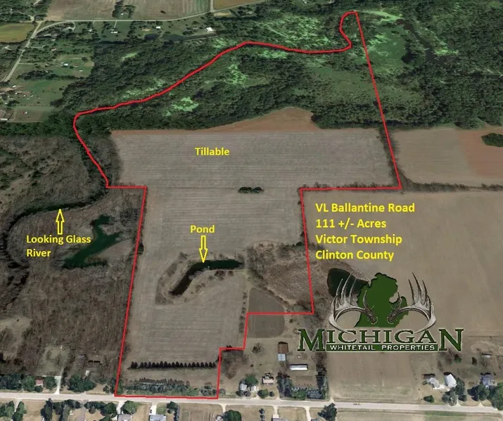 Welcome to SE Clinton County! Located approximately 2 miles East of US-127 on a paved road, sits this large parcel of both tillable and wooded land with just over 3/4 mile of Looking Glass River frontage. The property is fenced along the road with a gate at the entrance and mature pines for extra privacy. An old well (working condition unknown) once used for irrigation/livestock purposes is located in the Southwest corner. There are approximately 65 tillable acres with the remaining 46 acres of wooded recreational land. If you want to own riverfront property, this parcel definitely has it with the entire northern border consisting of Looking Glass River frontage! This property is truly an outdoorsmans dream with the opportunity to farm, hunt, fish, canoe/kayak on the river and enjoy the peace & quiet of the outdoors while only being minutes & 5 miles from the City! But wait, that's not all the property has to offer! There is a row of apple trees in the SE corner of the property that lead to a secluded and very private spring fed & stocked pond with a small open campsite area and floating dock with a ladder that you can fish from or jump in & go for a swim! I noticed many bass and panfish while standing next to the pond and also many rubs in the surrounding brush for another great hunting spot because of the cover and water source. There are many oaks, maples & cherries throughout the woods with several open grassy areas excellent for possible small food plots for the deer and turkey. Large tracts of property such as this one are becoming more difficult to find all the time and especially in Southern Clinton County. There are many different potential build sites on the property if you are looking to build that dream home or just enjoy the property the way it is. Either way, don't pass up this opportunity and give me a call today to see this very unique income producing property!