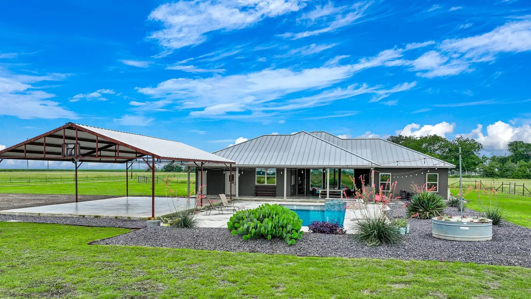 House: 2700 Sqft custom home completed in Spring of 2018, with stained concrete floors adorning every inch, granite counters in the kitchen, and lofty 12 ft ceilings, accentuating the grandeur of the living, kitchen, and dining spaces. Cozy up by the electric fireplace, while looking through the windows to the East towards the pool and open pastureland. Above, a standing seam metal roof crowns the residence, a testament to both style and durability. Its 100% Stucco/Rock faade exudes timeless elegance. The current owners did not overlook any detail with an energy efficient house with spray foam insulation and a HVAC unit to heat and cool during hot summers and cold winters. Under the same roof sits an outdoor kitchen and backporch area where grilling and relaxing combine in the ultimate outdoor living experience.