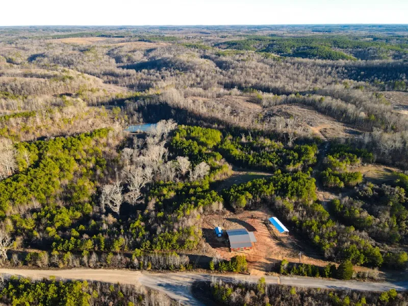 If you're searching for your very own hunting lodge or getaway, this is the one! With scenic rock formations that are a MUST SEE, a private 1.25-acre pond, city water, a septic tank, power (with a streetlight), fiber internet, a brand-new RV barn, a 12-by-20 storage shed with power and a roll-up door, internal roads and trails, food plots, shooting houses, and an abundance of wildlife, this one has it all. The main house is 30 x 40 and has three covered porches: one is 12 x 30 and the other two are 12 x 40. The back porch is fully screened in. The interior of the house has a 40-inch TV, refrigerator, stove, washer, dryer, and electric tankless water heater. It also includes a brand-new Mitsubishi mini split air conditioner - a 28000 BTU heat pump. It features closed-cell foam insulation on every interior surface, including the ceiling, to ensure that you keep cool in the summer and warm in the winter. Also, a septic tank for a three- bedroom, two-bathroom home is already installed and approved. Another fantastic feature of this property is the enormous 16 x 50 x 16 RV shed, which has water and 50 amp electricity! The pond boasts a pristine and untouched appearance, and the owner has observed ducks gracefully landing on the water! Three shooting houses are strategically positioned, overlooking established and cleared food plots, ready for you to cultivate and attract wildlife. Three brand-new gates access the interior of the property, and numerous roads and trails provide convenient access to all areas of the land. The interior roads are well maintained and may be readily driven with a UTV or four-wheeler. The topography is best described as gently hilly terrain with some steeper sections along the distinctive rock formations. The timber is young and robust, with a few stands of mature hardwoods. This property is surrounded by 3000 acres of timber company land, making it ideal for individuals seeking tranquility. In addition to all of this, there are several reservoirs nearby that allow public fishing, as well as three wild game processors within 20 minutes. If you're looking for country living, a hunting hideaway, or your own private getaway into the countryside, this is the place.