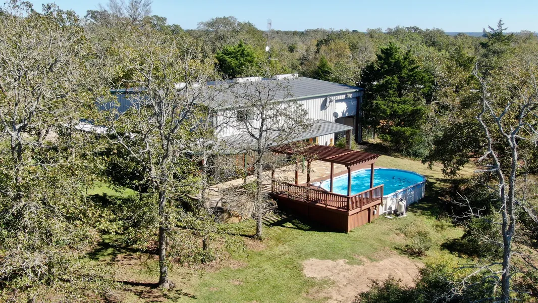 Delightful two story barndominium in the coveted 22 Hills neighborhood of Milam county that offers great views and rolling landscapes. At almost 20 acres and with elevation changes of over 80 ft this rolling property is much more then just an amazing view. This four bedroom custom home has room for it all with 3016 sq Ft heated/cooled that includes a large studio space full of natural light and additional 610 sq ft shop space, insulated, with access from large overhead doors. Built with entertainment in mind this home features a large 1000 sq ft stone patio with fire circle seating and beautiful sunsets over the above ground pool and deck. Enjoy your company with the large open concept that includes the dining room, living room and recently updated kitchen. New updates include new quartz countertops in the kitchen and a new master bath walk in shower. Upstairs you will find 3 bedrooms, or two bedrooms with a den/play area. Need more space for projects? This property includes a 25' x 50' shop/barn with one half enclosed with overhead doors. With one pond, walking trails throughout, and large fenced garden this property is abundant with wildlife and native fauna. Many UTV/ATV trails wind throughout and offer potential for some hunting to occur. Additional features include a greenhouse, screened porch, 21' x 26' covered carport, 20' x 29' fenced dog kennel, sprinkler system, gated entrance, and much more! Water Well, Restrictions, aerobic septic system. High Speed Internet.