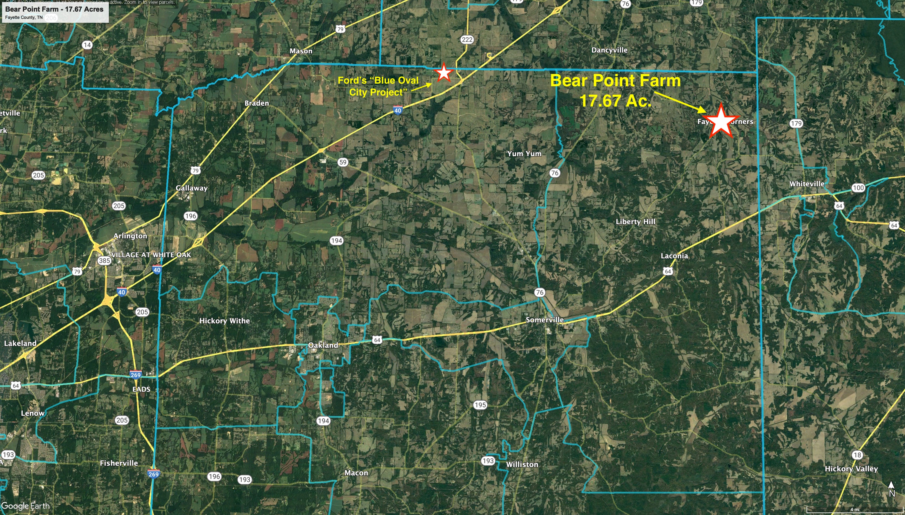 From an investment perspective Bear Point is less than 20 minutes from Fords Blue Oval City Project. The property also has significant road frontage on Fayette Corners Drive (770+/-ft.). Additionally, the location is very convenient to I-40 being only 8.70 miles to the Dancyville Exit which is #47.