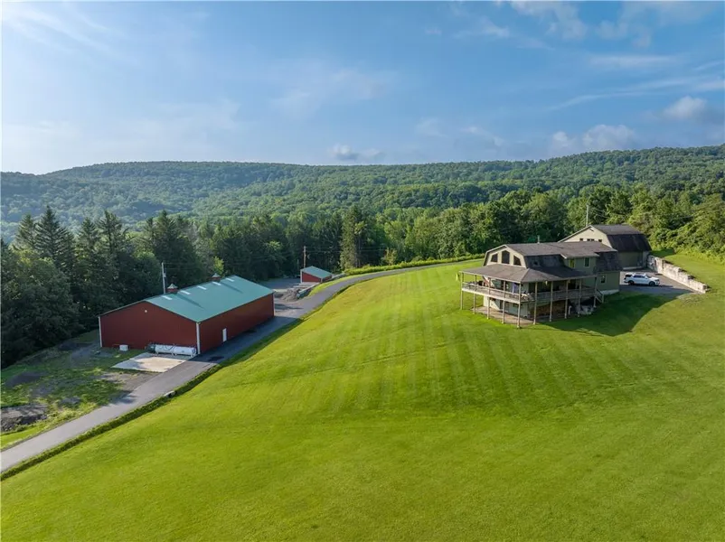 A true find in beautiful upstate NY ~ sitting on a serene & private hillside, rests this splendid 150 acre estate with stunning views, and a magnificent 5 bedroom, 3 full bath home. An idyllic spot for a hobby farm or horse property! Custom kitchen features stainless appliances, granite&quartzite counters, huge island, large walk-in pantry and opens to the family room, bar & dining area, with a central wood stove. State of the art Unico heat and AC system in house AND garage (radiant in garage floor), home theater system, and a sprawling covered deck to appreciate the stunning views. The 4 car garage has finished rec room above with a full bath, and covered deck. There are trails for horses, hiking, or ATVs, and several streams throughout this beautiful land, which also connects to the state snow mobile trail. This property is set up with a 60x100 Morton Building large enough to house yo...