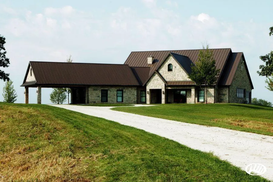 - Exterior features stone clad walls, standing seam metal roof, and carport