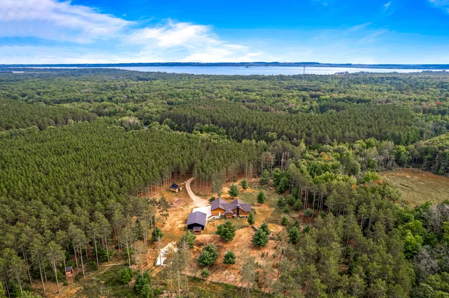 Midwest Land Group is proud to offer your forever home! This custom Golden Eagle Hybrid Log Home built by Pine Harbor Log Homes has gorgeous top-end finishes. The home and outbuildings are set on a peaceful, private wooded 10 +/- acres close to Shawano Lake. Built in 2018 amidst towering red pine trees, the approximately 2,860 square foot home has a thoughtful layout. The main level is characterized by tile and wood floors, stunning cabinets, and the perfect blend of modern finishes with rustic appeal. The wood-burning fireplace in the great room with floor-to-ceiling modern stone finish is simply awe-inspiring. Additional highlights include the covered front porch, gorgeous kitchen with granite island, and beautiful four-season back porch/office.