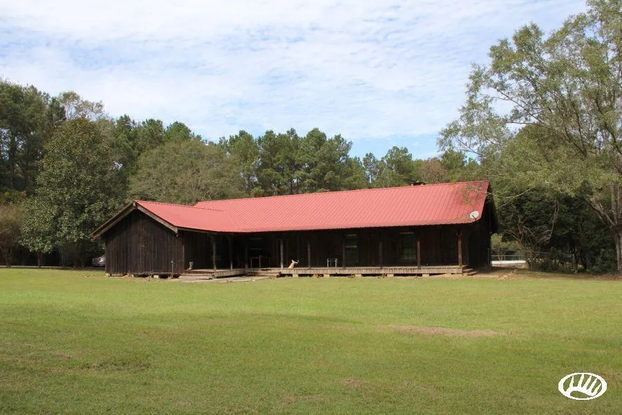 Drive through the gated entrance, down a winding drive lined with beautiful crepe myrtles to a cedar lodge that is approximately 4,700 sq. ft. The lodge is constructed mostly with western cedar walls and large beams. There are 6 bedrooms and 6.5 bathrooms to accommodate the whole crew. The main cabin has a huge open living room with a stone fireplace, built-in gun racks. The kitchen has two large bars, commercial stove & vent hood, a walk-in cooler that can be accessed from the kitchen or the outside. The outside consists of guest quarters, with bedrooms, bathrooms and kitchenette that sits beside the pool. The land is a mix of merchantable beautiful pine and hardwood timber with a lot of Whiteoak !!! There are trails in and around the property for easy access to the pond and through the hardwood. The lodge has been vacant and therefore needs some updating/repairs but has tons of potent...
