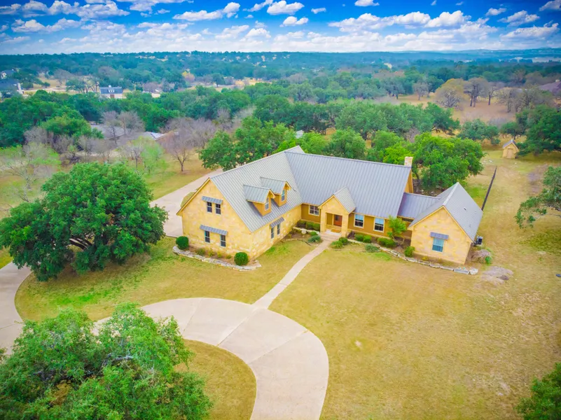 Beautiful home in the gated community of Double Horn. Sits on over 4 acres at the end of a cul-de-sac. Beautiful private lot with mature oaks. Inside find extended ceilings with recessed lighting and crown molding. Each of the 4 bedrooms has an attached full bath. Powder room for guests. 3 bedrooms including master down and 4th bedroom upstairs lined with cedar. 4th bedroom is big enough to be a game room or easily put up a wall and have both. Possibilities are endless. No carpet except on stairs. Kitchen opens to living and has stainless steel Kitchenaid appliances including a 6 burner chef's stove, kitchen island with additional storage and work area. Custom cabinets. walk-in pantry. Formal dining can also be office with built-in shelves. Owners ensuite includes dual vanities, separate frameless shower and jetted garden tub. Outside you'll find a covered patio and 7 ft wrought iron fence. Free air gazebo with fireplace. Attached garage has a workout station that conveys, 3 car garage that is 1277 sq ft and can hold more than 3 cars and enough room for a boat. Additional detached garage/workshop is 1012 sq ft and can accommodate at least two cars with enough room for a workshop. 4 sides stone and standing seam metal roof built to last. 4 HVACs and 2 water heaters replaced in 2021, water softener, on well water now but can be tied into the water line. Neighborhood amenities include pool, walking trails, park, lake, playground and more.