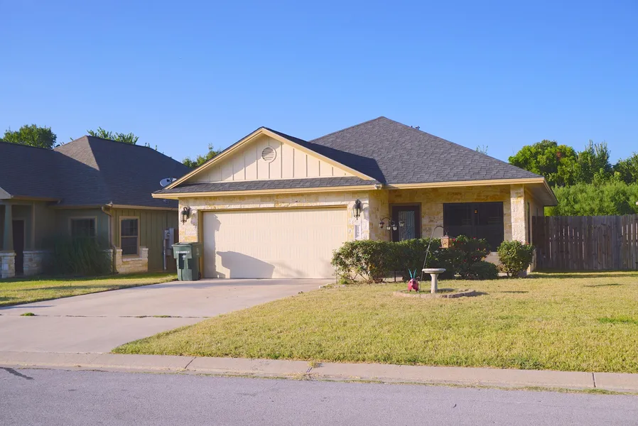 Beautiful home next to Blinn! This 3BR/2BA brick/rock home has many upgrades including granite in kitchen and bathrooms and crown moulding throughout. Open concept floorplan with kitchen/bar seating. Yard backs up to greenbelt for more privacy. Storage shed in back conveys.