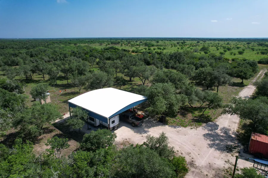Comfortable improvements allow for immediate enjoyment by the new owner! A sturdy 40 x 40 metal cover is installed over a 2022 model travel trailer for all the comforts of home. 200-amp electric service, a 50-amp RV plug and a new water well are located at the metal cover. The area around the camp has been selectively cleared to create a peaceful spot to relax and enjoy a morning cup of coffee or a fire in the evening. The property consists of thick, diverse brush loaded with oak trees and wildlife. There are several open areas where food plots could thrive in the fertile soils and roads and senderos provide access to all areas of the ranch. The land is located at the end of a county road and down an owned driveway providing tremendous privacy while being only 15 minutes from groceries and supplies in Beeville. You can also be at the coast in approximately one hour to do some fishing!