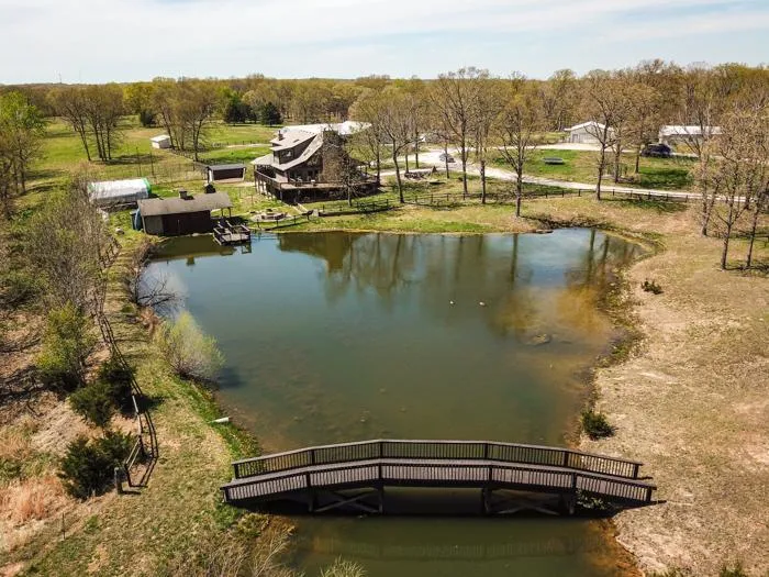 The magnificent 5,000 square foot log sided home is extremely secluded, sitting at the end of a dead end road on 46 acres of timber and pasture. The road frontage of the property and driveway are lined with wood beam/woven wire fencing which winds down past one of the stocked ponds to the house. The rustic home consists of 5 bedrooms with 3.5 baths, and high quality finishings. The beautiful master bedroom is on the main floor and has a large walk in closet, fireplace, sitting area, great views, and an exit onto the wrap around deck with a hot tub right out the door. The master bath is very large with a walk-in shower and jacuzzi tub. A long, lodge style table has served as the focal point for the dining area, which could be converted to a living space off of the kitchen with towering ceilings and a stone fireplace. Ample natural light is allowed in by skylights and large picture windows on either side of the fireplace. The kitchen was remodeled in 2004 and boasts gorgeous custom cabinetry, a full size Frigidaire refrigerator and freezer, LG range and oven, and a GE microwave. A butcherblock style island/eating surface adds to the dynamic of the kitchen before heading into the galley style food prep, spice, and food storage area, equipped with an additional industrial refrigerator. An open staircase leads up to a loft area, flanked by a sitting nook providing an incredible view of Truman Lake. Two large bedrooms can be found upstairs, sharing a large double vanity bathroom. In the walkout basement you will find an additional bedroom, full bath, cozy living area with a custom wood wet bar and fireplace, along with a workout/prayer room. In the other half of the basement there is a large finished space that could be used as another bedroom or storage area. The utility/storage/laundry room can be found through this space. One of the neatest features of the home is the expansive wrap around deck with multiple exits from the house.