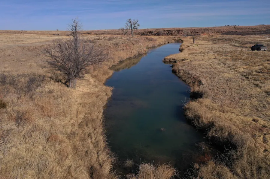 Attention hunters and fishermen! Here’s a beautiful western Oklahoma property that offers both hunting and fishing. It has a newly remodeled cabin, making it a great place getaway to rest and relax! The land itself is open and rolling. It has pockets of timber, brush, thickets, and heavy grass - all providing great cover for wildlife. And, this area can produce some big whitetail bucks. The highlight of the track is the water which is a rarity in the area. There are 2 spring-fed creeks running through the property. One of which, Blue-line Creek, has been widened and deepened to create an awesome fishing spot nearly 400 yds. long! It offers some great Bass and Channel-cat fishing. The owners have spared no expense while improving the property. It has a great fence, gates, gyp-rock road, and even a new concrete creek-crossing. There’s a lodge/cabin with all the amenities of home and it’s b...