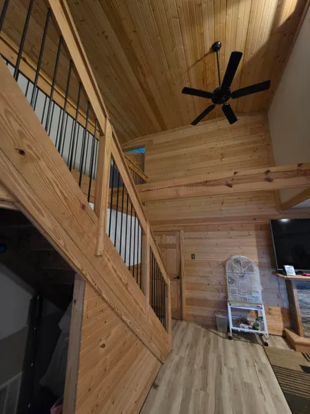 Step inside and you'll be greeted by a grand open staircase wrapped in classic car siding, with shadow-box windows that let the natural light pour in. The open feel carries right out to the deck off the dining room—perfect for sippin' coffee, watchin' wildlife, or unwindin' at the end of the day.