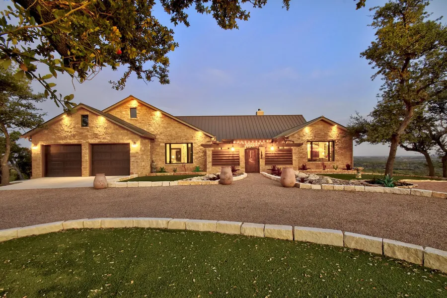Bella Visa is a beautifully curated blend of dramatic long-range views, sophistication, and comfort set upon an exceptionally private 23+ acre gated hilltop in a luxury ranch community which features free roaming exotic animals, 2 stocked lakes, and an enchanting 80+ acre nature preserve. Unrivaled 360-degree Hill Country Views at over 1600 are captured from every room in this artfully constructed 3 bed, 3.5 bath single story Hill Country Contemporary residence comprised of an inviting courtyard, 3 generously sized bedrooms all offering full ensuite baths, luminous chefs kitchen boasting custom antiqued cabinetry, double sided cave stone fireplace, entertainers den, and perhaps the most striking outdoor living Hill Country has ever seen. The exterior was intuitively designed to be both attractive and low maintenance with leuder stone walls and climate friendly hardscaping accentuated wit...
