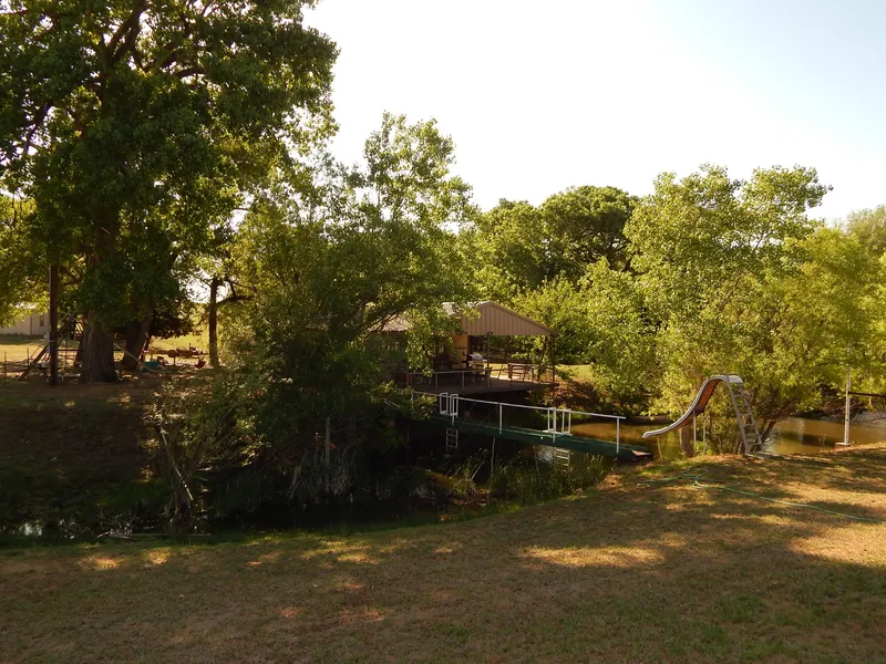 Only a mile and a half south of the Salt Fork of the Red River, pond is stocked with bass, catfish, bluegill and crappie. Once a natural spring, seller now pumps water into the pond that doubles as a swimming hole. Oversized swing set and volleyball court provide fun too.