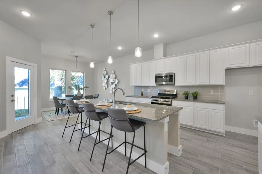New build, move-in ready, never lived in! Beautiful 24 hour manned gated golf community with enchanting entrance and stone elevation! True open concept floor plan, with varying ceiling heights of 10 to 12 feet. The kitchen is furnished with 42" cabinets, granite countertops and stainless steel trimmed microwave, range, and dishwasher. All bathrooms completed with granite countertops and tile. Exterior features include aluminum gutters, sprinkler system and rear covered patio.