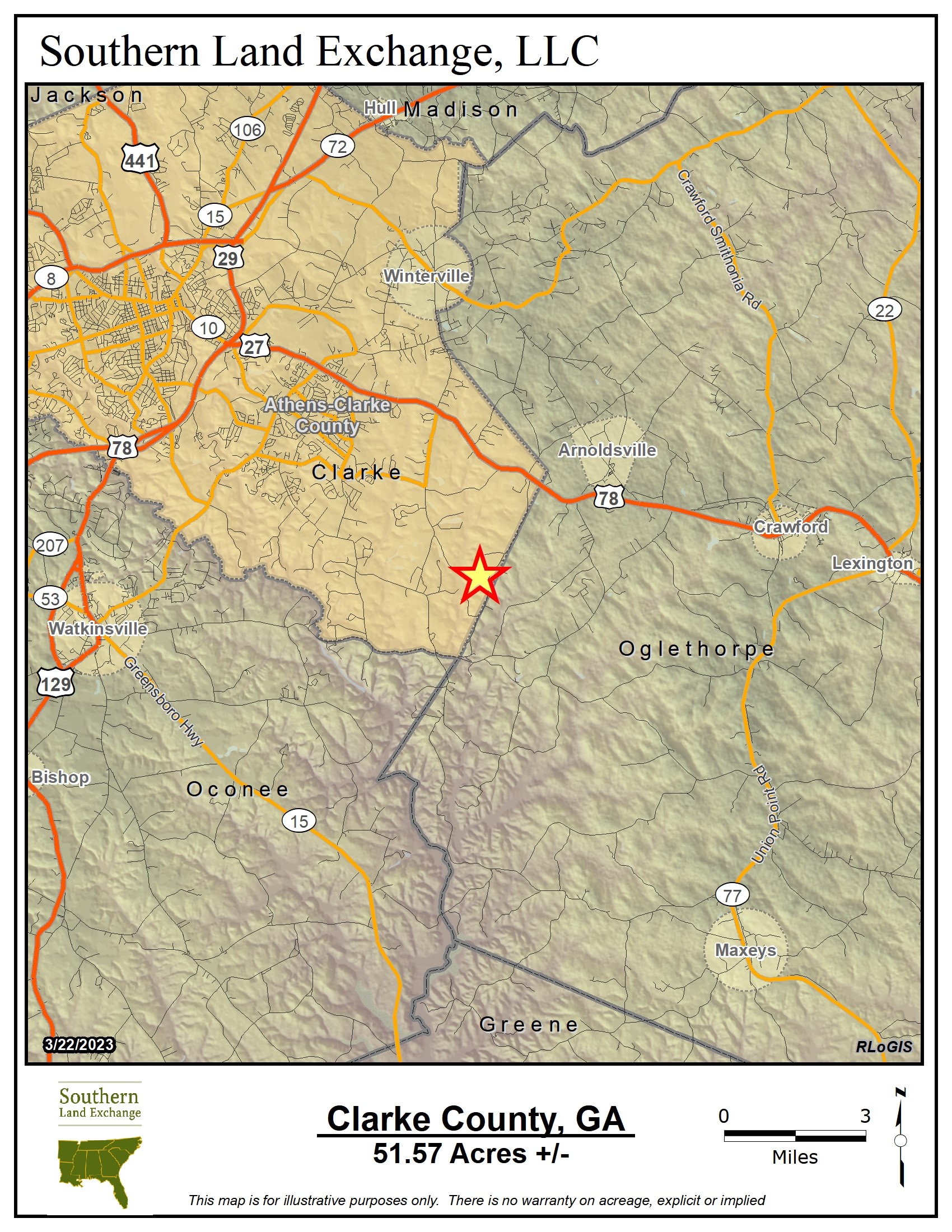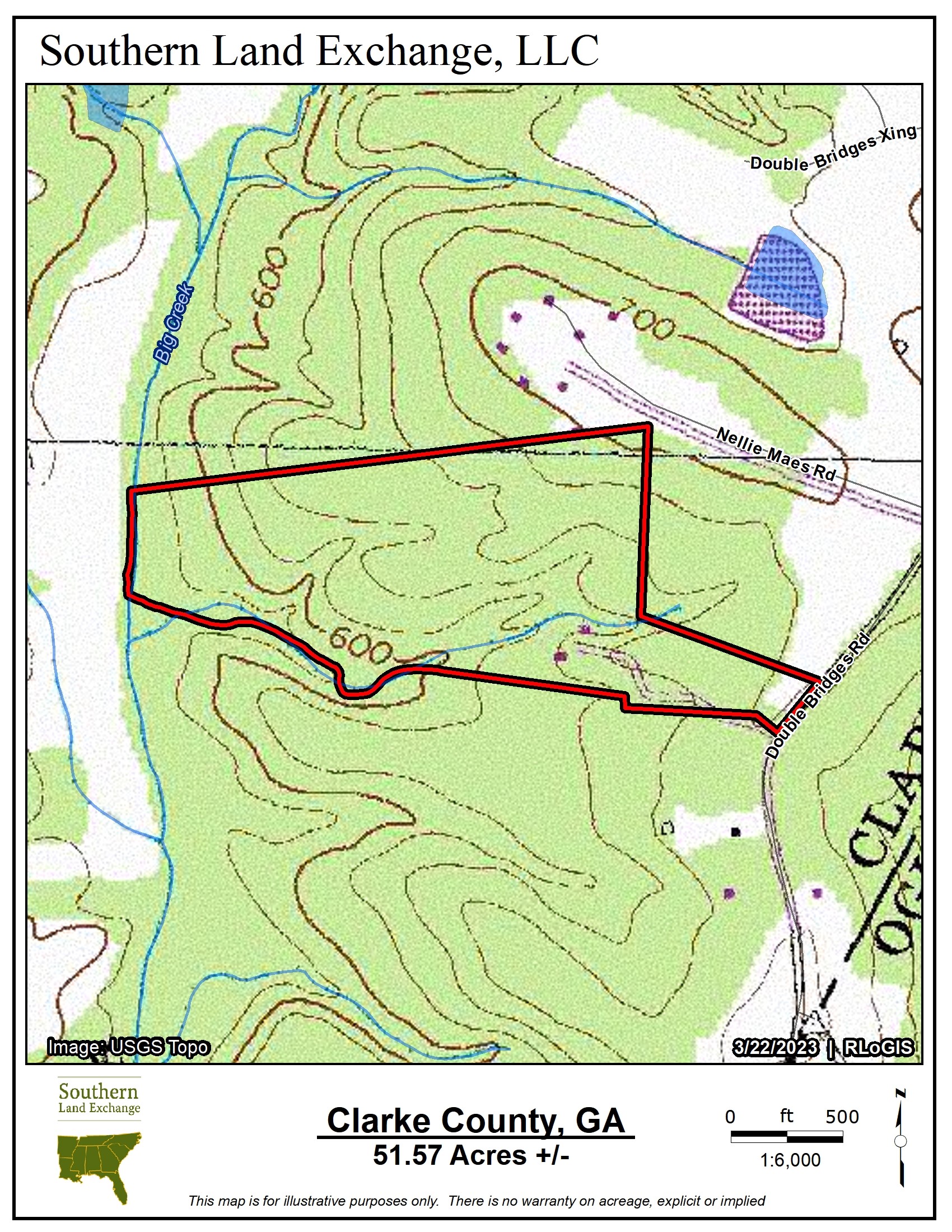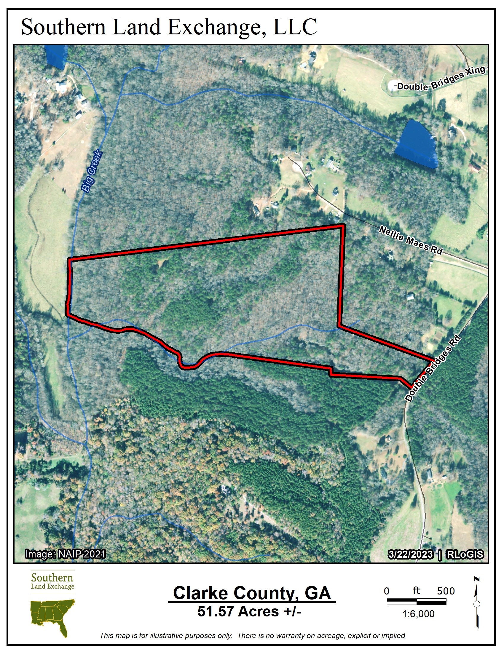 Southern Land Exchange is proud to present Big Creek Tract, a +/- 52-acre mostly wooded, AR zoned property located in Winterville, GA. You heard that right, a large acre tract in Clarke County. This property is ideal for the individual or family looking for a property close to Oconee County without the Oconee County prices. In Oconee County, this same property would run $15K per acre or more and this tract sits only 2.7 miles from the Oconee County line. Big Creek Tract is absolutely beautiful with overall good topography and tons of buildable acreage for your own private estate with the option to build far off the road, completely secluded and away from any road noise. On the back boundary line is Big Creek, a wide body blue line creek. It's called Big Creek for a reason; after a good rain, it becomes a really large body of water! There is a mix of natural regen timber and planted pines on the property. The property is made up of about 12 acres in pines and the remainder is in hardwoods. For the recreational or hunter minded buyer, there is a great internal road system for accessing most the property, as well as, multiple food plots. There is also a natural spring on the property that produces water year-round. The property is located on Double Bridges Road which is a really unique road that connects travelers from the east side of Athens to the Oconee side of Athens in less than 5 miles. This property is conveniently located only 10 miles from center of Athens and the University of Georgia. On the Oconee County side, the property is located only 10 miles from Watkinsville town center. There is a sufficient +/- 300 ft of paved road frontage on Double Bridges Road. Lastly, for the developer minded buyer, the property is zoned AR which would allow for a large lot subdivision. For more information or to set up a showing, contact Travis Ebbert at 706-614-8840.