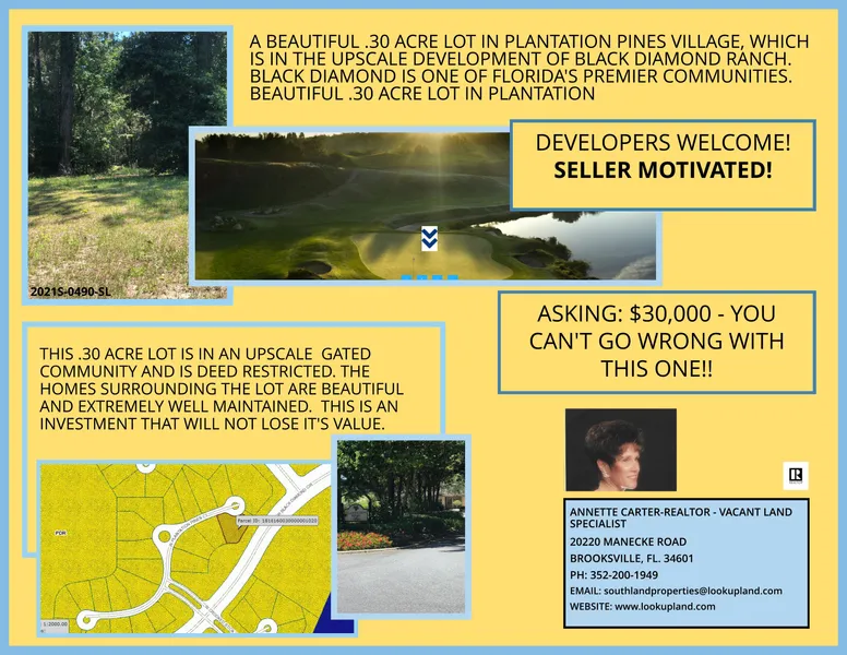 Drop dead gorgeous estate lot located in Black Diamond Ranch's pristine subdivision, Plantation PInes Village. Black Diamond is one of Florida's premier residential and golf communities. This lots entry is on a cul-de-sac, right off the Black Diamond entry (Black Diamond Circle) with a gated entrance. Just a short distance from the 4 hole, 3 par practice golf course. Participate in various amenities; such as golfing, fishing, boating, biking, swimming, fitness, and many more, with a Black Diamond membership, upportunities are available for purchase which is optional.