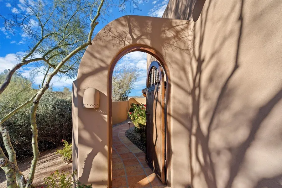 Tucked away from the street, this Santa Fe-style home offers a sense of seclusion. A gravel driveway, lined with fruit trees, leads to a gated entrance that opens into a private garden courtyard. The kitchen features a large island, a walk-in pantry, and all the essentials to make every meal a delight. The living area and kitchen offer uninterrupted views of the surrounding mountains, ensuring a private and picturesque backdrop.Each bedroom comes complete with its own full bathroom, providing comfort and convenience for residents and guests. The separate casita, with its private entrance, ideal for guests, extended family, or even as a home office. A true highlight of this property is the roof terrace, which boasts 360-degree views of the majestic Arizona landscape. Furniture is included.
