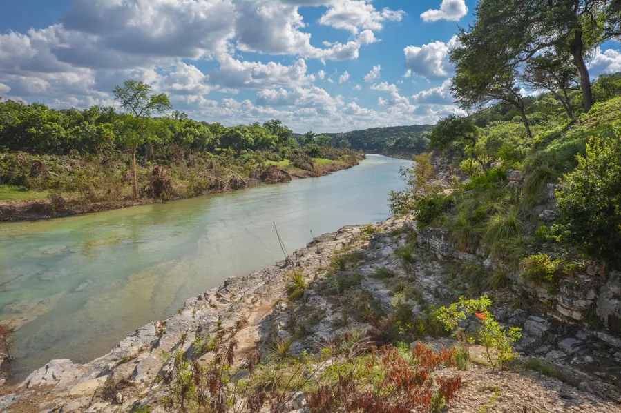 The land is generally level terrain, with some slight hills until the land approaches the Blanco River. Rockier Hill Country terrain and dramatic bluffs are present near the water. There is also a small cave near the cliffs to the east of the luxury cabin. Much of the property is primed and fenced for grazing cattle, and contains a stock pond. Massive mature oaks are present throughout.