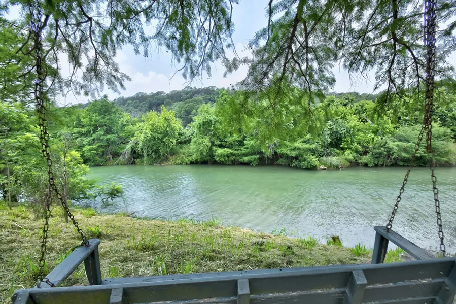 Stunning Blanco River Frontage featuring a charming renovated Sunday Haus and panoramic Hill Country views on a peaceful stretch of crystal-clear, year-round water just 12 minutes from shops and dining in Wimberley. A perfectly tranquil getaway cottage, this property offers an enchanting vintage feel with all the benefits of modernized plumbing, electrical, brand-new appliances, and septic system. Mesmerizing river views are showcased off the kitchen and from the open living area framed out by antique cedar posts and accented with real wood flooring, tongue and groove walls and a cozy rock fireplace. Upstairs, the cabin opens to a full bedroom suite including a private balcony with a birds eye view of the meandering river and beautiful contiguous ranch. Allow yourself to unwind by enjoying gazing at the sparkling river while listening to the harmonious sounds of native bird songs and the Hill Country breeze rustle through shady heritage cypress trees. Ideal for an artists or couples personal retreat, the minimal footprint also lends itself to the possibility of constructing an additional riverfront suite. Truly an angler and kayakers dream property with miles of river to swim, fish, and paddle. Well volume is reported to be 100gpm. Just 45 minutes from Austin or San Antonio. HOA River Park Access included.