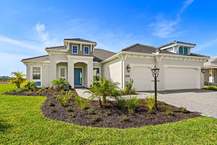 NEW Country Club Home. This rare maintenance free 2024 home sits on almost a half-acre, unheard of! Ready for the wildlife/bird spectators, the home has a large preserve view in the rear as well as a preserve to the front. This sought-after Sanibel features 3 bedrooms, 3 baths, with the extended Club room with walkout sliders. As soon as you step though the front door, bright and airy, your eyes continue through to the vanishing sliders, past the hot tub, pool and extend lanai to the view! The home has many upgrades. Entire home has plank ceramic tile throughout, extended crown molding, tray ceilings and 8 ft. doors. Beautiful hardwood cabinetry soars towards the tall ceilings, finished with quartz and upgraded gas appliances, fit for the best chef. The primary features 2 large walk-in closets, a super-sized bath with dual sinks, Roman shower and soaking tub. What could be more inviting≠ The decadent lanai is finished in marble tile, plumbed with gas/water/electric ready for the outdoor kitchen. The saltwater pool is heated with natural gas. Decisions, decisions, golf, the beach, the resort pool, the dog park or pickleball≠ Never mind, maybe a frozen cocktail in the jacuzzi ten steps away! Where do you want to start your new journey≠