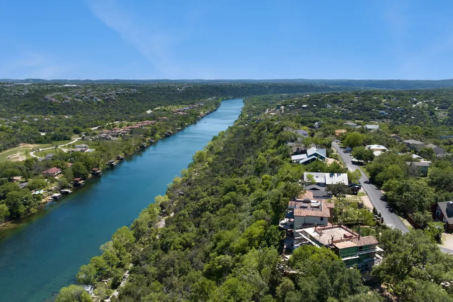 Exuding charm and encompassed by nature, an eclectic residential offering awaits. Proudly gracing the cliffs above the lake with panoramic awe inspiring views of Lake Austin AND Lake Travis, you are nestled into a cozy and luxurious tree house, a life better lived, all at The Brass Buttons Bungalow of Lake Austin! Perched on a hill, this gated waterfront home offers you the coveted lake lifestyle everyone dreams about, with a shared tram down to the fun and adventures lakeside, or a short jaunt by road through the private lakeshore park, the best of both worlds. As you enter the gates of this hidden gem, you are greeted with bespoke details and memorable finishes with floor to ceiling glass windows and doors, flooding the home with natural light. Custom teak floors and solid wood interior doors from Mexico and India offer a curated touch, while an open kitchen featuring granite counterto...