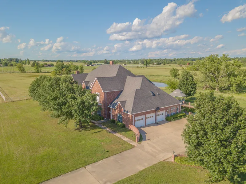 Outstanding opportunity to own a truly breathtaking piece of property. This beautiful three-story custom home sets on a hill surrounded by beautiful trees and over a thousand feet of pipe fencing. A huge concrete parking area and the 20x42 swimming pool are adorned with wrought iron fencing and brick columns. There are a total of six bedrooms with six full sized bathrooms, as well as two guest half baths in the over 8,000 square foot interior. A grand front entry with a winding oak staircase and beautiful chandelier welcomes you into the home. Along with the living room and large breakfast area, the home boasts a formal dining room, formal living room, library with fireplace, sunroom and even has an elevator. The trim level of this property is exceptional with custom built in cabinets throughout, hardwood and tile floors, nine-piece crown molding, elegant light fixtures, intercom system and two fireplaces. At the top of a second set of stairs, you will find a large bonus room with attics on each end that makes up the third story. The acreage has a 1-acre pond that sits behind the house in between gently rolling hills with a creek meandering from one end to the other. There is a horse stall next to the house and plenty of green grass for your horses or cattle. Through an over-head entry with cattleguard, you will find a 40x60 steel building with a large lean to that is surrounded by gravel. Priced to sale, this property has a lot to offer. Call today!