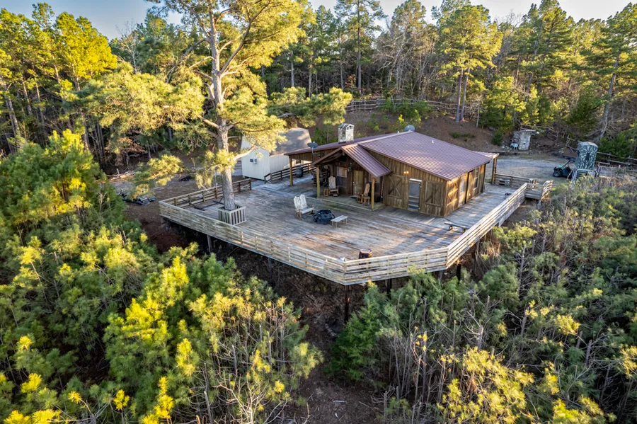 The Lost Cabin in Brownsboro, Texas is one of a kind! A partially furnished 2 bed, 2 bath 1,100 square-foot cabin sits at the highest elevation of the 26.5 +/- acres retreat. With a picturesque view sitting on the oversized back deck, you will see miles and miles of the rolling terrain in Henderson County.