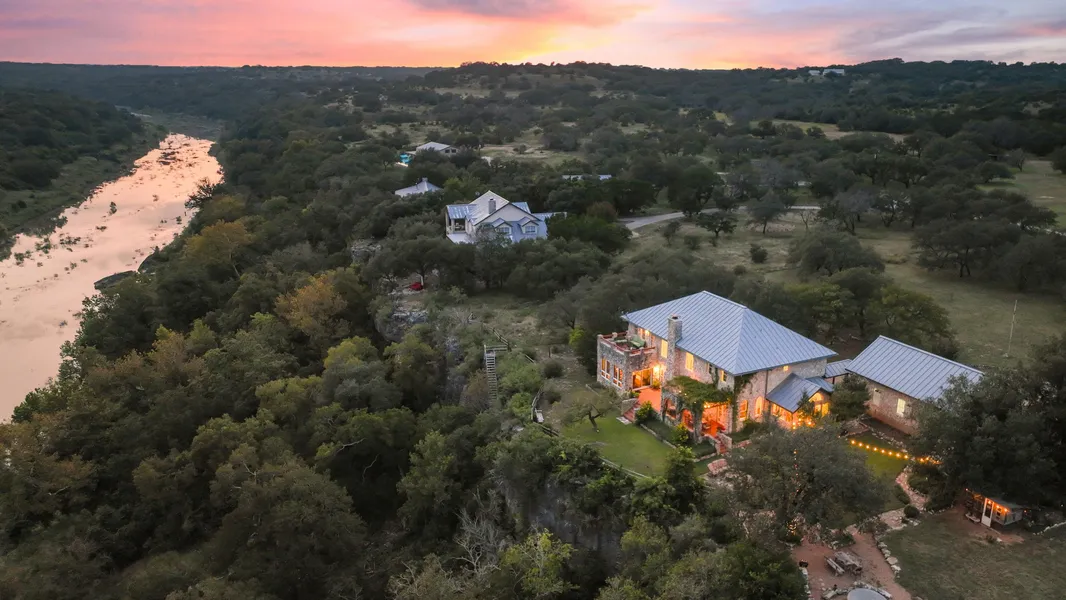 Perched above the canyons of the Pedernales River, Breezy River Villa is a rare Hill Country estate where peace, privacy, and potential converge. Situated on 2.8 acres with 200 ft of spring-fed river frontage, this countryside villa offers a timeless blend of natural beauty, refined craftsmanship, and self-sufficient living, just 45 minutes from Austin. Constructed with native Texas stone and a standing seam metal roof, the 4,549 SF residence is both solid and soulful. Inside, you'll find vaulted ceilings, arched doorways, terracotta floors, granite counters, and panoramic windows framing expansive canyon views. Multiple terraces and a veranda offer quiet spots for outdoor dining, lounging, or simply listening to the breeze move through the oaks. The main house features a grand living room with a wood-burning fireplace, a spacious kitchen and breakfast area, a private sunroom off the pri...