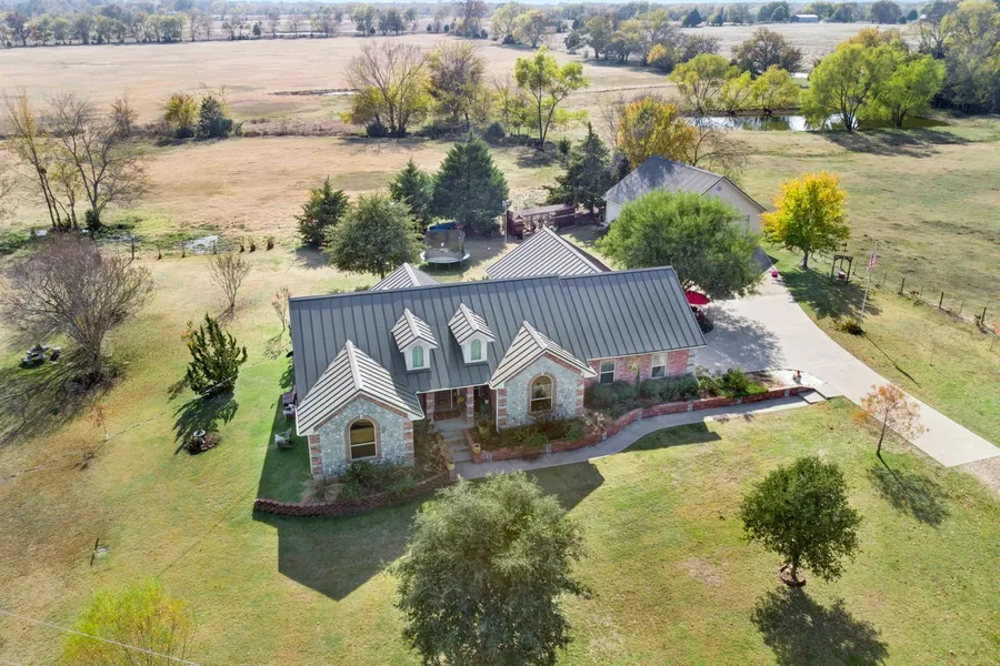 Beautiful 3bed, 2bath custom-built home on 8 acres, located behind an automatic security gate. Have piece of mind & low maintenance with the reinforced foundation, heavy metal roof, double insulated windows, & blown in attic insulation. Besides the elegant wood floors when entering, you'll also notice the raised ceilings & handcrafted pecan cabinets, trimmed with ash wood. The kitchen continues with custom cabinets with slide outs, granite counter tops, double oven, island sink & breakfast area. Enjoy a large patio overlooking the surrounding rolling land plus landscaped yard, raised flowerbeds, pecan & fruit trees, & garden spot. Bonus 32x32 shop with electricity & double roll up doors. Perfect spot down a long drive!