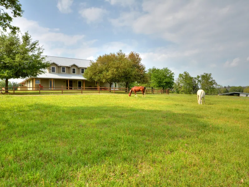Bring the Horses! Private, quiet, secluded setting. Updated, remodeled home sits high on a hill overlooking glistening pond. Gorgeous kitchen w/ unique granite, SS appliances & cherry cabinets. Brazilian fabricated hardwood floors. Sparkling pool, spa, covered patio. Gated entrance. Owner owns 1/3 undivided interest in private road. Nice mix of woods w/ pines, oaks & pastures. Nice horse barn w/ 9 stalls, tack room & hay/equipment storage. Pole barn w/ guest qtrs. (384SF), outdoor shower & chicken coop.