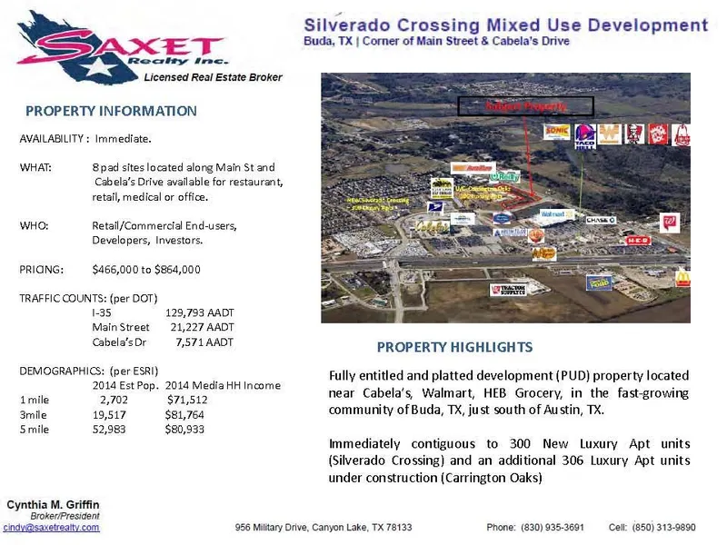 These 8 remaining pad sites are all fully entitled and platted with utilities and interior circulation roads in. This property is a Planned Unit Development (PUD) permitted through the City of Buda. The pad sites are in the immediate vicinity of Cabela's, Walmart & HEB Grocery stores. Additionally, they are immediately contiguous to 300 new luxury apt units in Silverado Crossing, with an additional 306 luxury units in Carrington Oaks currently under construction.