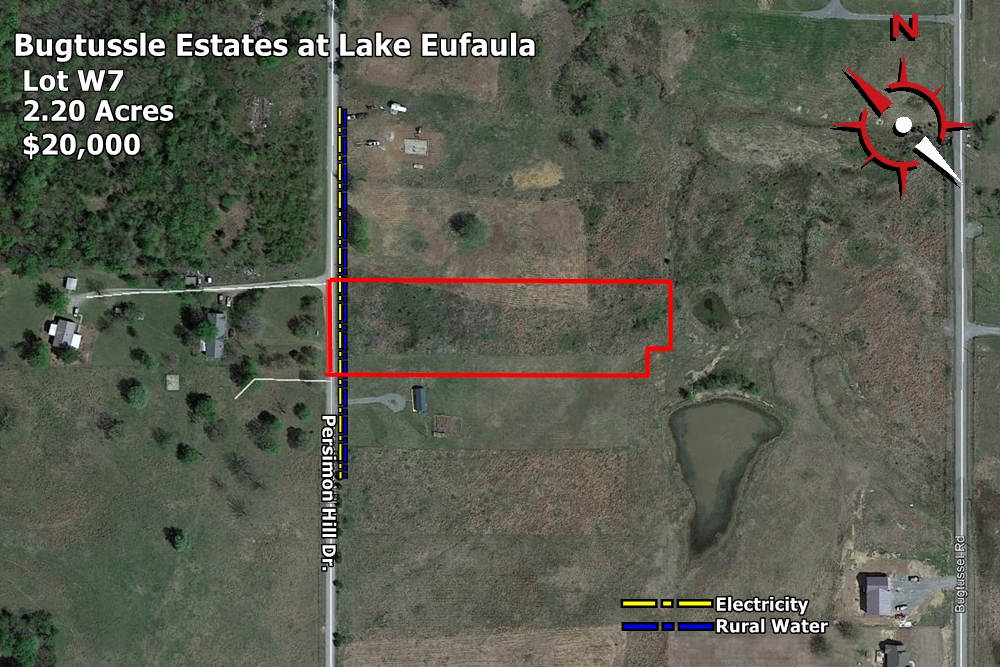 Located in the community of Bugtussle, Oklahoma, this home or cabin lot offers fantastic recreational opportunities at Lake Eufaula. This 2.20 acre lot has county maintained gravel road access (Persimmon Hill Road and Flowery Mound Road) with utilities available. You will also get free use of the Bugtussle Community boat ramp located only 2 miles away. All lots have rural water and electric service.