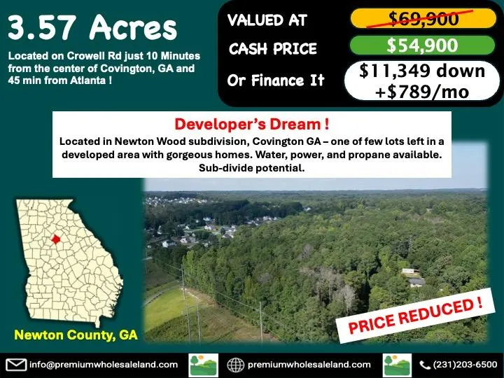 Dont miss your chance to own 3.57 wooded acres on Crowell Rd, just 10 minutes from downtown Covington and 45 minutes from Atlanta. This gently sloped lot (640-660 ft elevation) features 175 feet of paved road frontage, water, power and propane available making it a perfect investment for home developers. Zoned Agricultural Residential (A-R), you can build a single-family home (site-built, modular, or Class A manufactured) with potential for a tiny home as an accessory dwelling. This lot offers subdivision potential, No HOA, proximity to shopping, dining and area attractions such as Cedar Shoals Park, Walker Marina, and the Atlanta Botanical Garden. Large lots in Newton Wood are rare so act fast to secure this investment opportunity before it's gone!