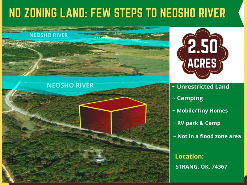 Located in STRANG, OK, 74367. The terrain is gently rolling and wooded suitable for stunning views in most directions. Imagine the possibility of not being in the flood zone area and no zoning at all where the owner can do whatever they want to do on the property.