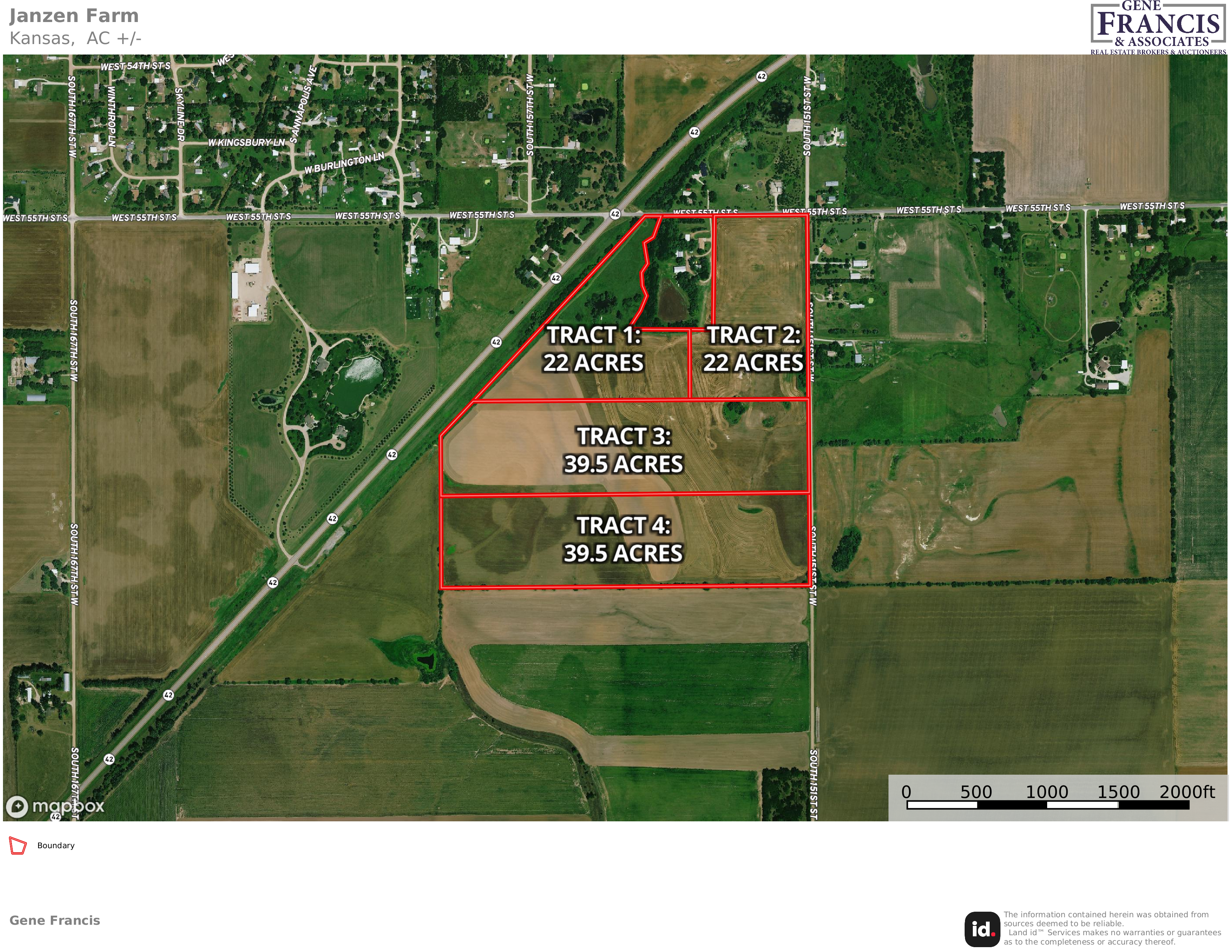 This 123 acres of coveted ground borders K-42 highway, just a few miles from the heart of Wichita. This special property is close to all of the city amenities while far enough away to provide sought after privacy and space. With paved roads to the west and north, each tract offers flexibility to build your dream homestead with no restrictions, provide additional income from cash rent on the cultivation, or future development. The four tracts are being offered through our multi-parcel auction process. The acreage can be purchased in single tracts, all tracts,...