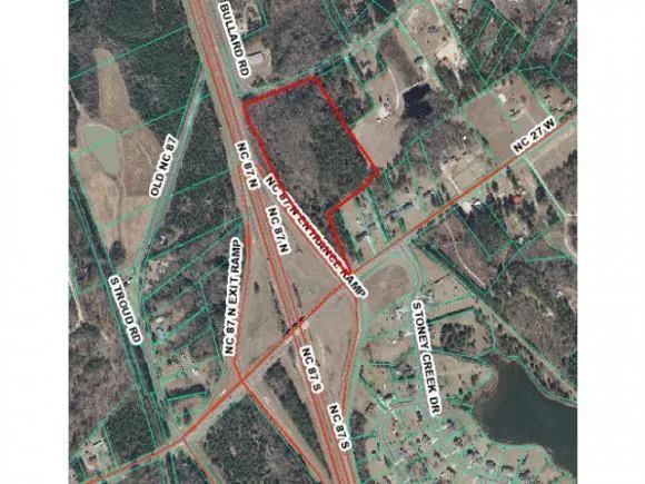 13.26 wooded acres at the NC Hwy 87 / NC Hwy 27 W interchange. Excellent visibility from 87. Frontage on Hwy 27 would allow for a sign, but no access. Access is Bullard Rd, off of Hwy 87. Commercial Zoning. Significant wetlands.