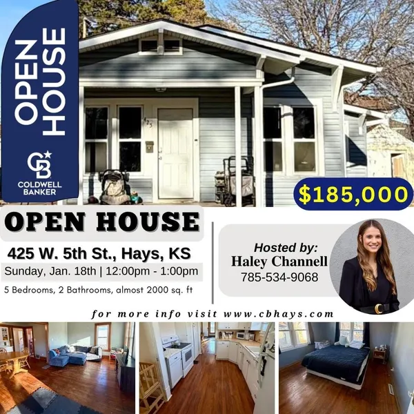 Spacious 5~bedroom, 2~bath bungalow located just minutes from Fort Hays State University and downtown Hays. This home offers nearly 2,000 square feet of finished living space, including a partial basement with three additional bedrooms—ideal for student housing or rental income potential. The main level features two bedrooms, a full bath, a comfortable living area, and convenient main~floor laundry. A private driveway and garage provide added convenience, while the flexible floor plan allows for multiple living arrangements. With its prime location near campus, this property offers strong investment demand, easy access to shopping and dining, and excellent long~term value. For more information, call Haley Channell with Coldwell Banker Executive Realty at 785~534~9068 or Crystal Hendricks at 785~341~3841...