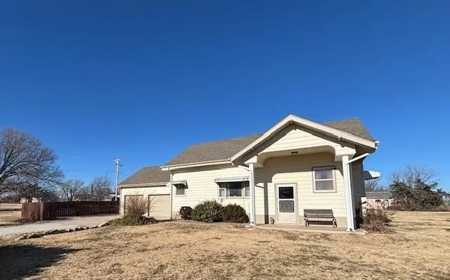 Incredible Opportunity on a Beautifully Maintained 2-acre parcel This stunning property boasts breathtaking views and wildlife and features 3 bedrooms and a full bath and fantastic garage space!! This charming property welcomes you with a lovely lawn and spacious 2 acres +\- featuring a white farmhouse bungalow-style home spanning approximately 1275 sq feet, with a partial basement. Includes a double attached garage, garden shed approx. 12 x 10. Enjoy peaceful country living in this move-in-ready 3-bed, 1-bath home that seamlessly blends original details with numerous updates. Step onto the south-facing porch for morning coffees and sunset views of the beautiful Kansas landscape and wildlife The spacious living room boasts a custom south-facing arch window highlighting the beautiful countryside, open to the dining area and kitchen flooded with appliances remaining with the property. Th...
