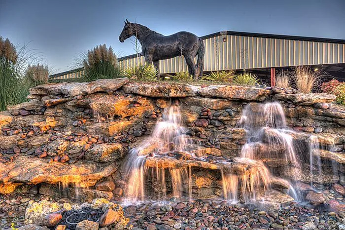 After getting your horses saddled, move across to the 100 x 200 indoor arena that was completed in 2011 and looks over a large landscaped water fountain, as well as, a fire feature. The arena has an automatic fly spray system, waters, plenty of lighting, and 3 Big Ass fans. Back across from the indoor are 2 large 50 x 100 hay barns with over head doors. that will lead out to the round pen. There are 5 covered stalls on the south end of one the hay barns, facing the automatic 6 horse walker.