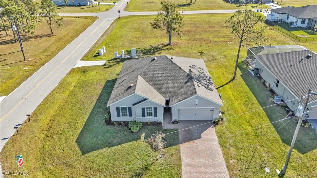 360 TOUR* FLOOD ZONE X - Expansive 2023 DR Horton Cairn Model 4-bedroom, 2-bathroom, 2-car garage with covered porch area in Burnt Store Village. This all-concrete block home offers a spacious 2,130 sq ft of living space (2,719 sq ft total) and is perfectly situated on a .24-acre corner lot. Step inside and be greeted by the open-concept floor plan, where 18” tile flows seamlessly throughout the living areas (with plush carpeting in the bedrooms). The kitchen features a large center island, quartz countertops, Whirlpool stainless steel appliances and a walk-in pantry for plenty of storage. The kitchen overlooks the living and dining areas, making it perfect for entertaining. Sliding doors lead out to the covered porch, ideal for enjoying the beautiful Florida weather. The spacious primary suite is tucked away at the back of the home for privacy and boasts an expansive walk-in closet and ...
