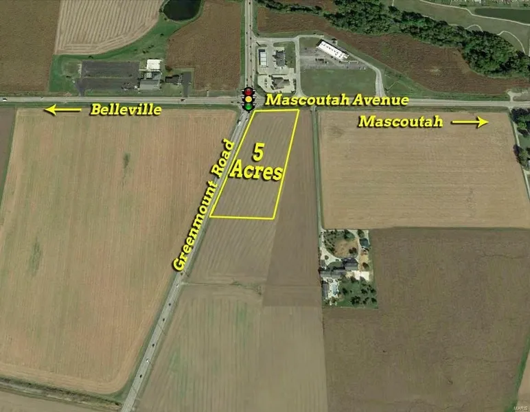 These 5 acres are situated on the Southwest corner of the signalized intersection of Green Mount Road & Mascoutah Avenue in Belleville, IL. There is approximately 776 Feet of Road Frontage with 490' along Mascoutah Avenue then 285' along Green Mount Road. The 5 acres are mostly level and is currently farm ground however the acreage is zoned Light Industrial and offers a multitude of possible uses. The property is located in the zoning jurisdiction of Belleville. The 5 acres were recently split from a larger piece of land therefore, the Parcel ID Number listed has only recently been assigned and as a result, the tax amount listed is a 2018 prorated amount. Location: City, Corner Location